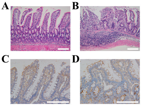 The rat (purchase from Changchun Yisi Experimental Animal Technology Co., Ltd., Changchun, China) IBD model was constructed with 5% (w/v) Dextran Sulfate Sodium salt (DSS) and 30% alcohol (v/v) simultaneously. Normal drinking water was replaced by 5% DSS and rats were given 15 mL 30% alcohol per kg body weight each day by oral administration [26,27,28]. The intestinal samples were detected by HE stain and antibody stain.