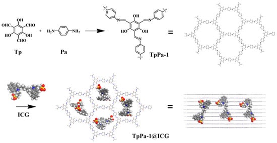 Triformylphloroglucinol (Tp) and paraphenylenediamine were adopted as building monomers to synthesize the POF network, TpPa-1, with 1.5-nanometer one-dimensional channels [29,30,31]. Due to the irreversible proton tautomerism of the enol−imine (OH) form, the keto−enamine form, the crystalline TpPa-1 possessed remarkable acid/base/thermal stability, facilitating the application in the field of biological imaging (Figure 6). Accordingly, the ICG agent was introduced into the one-dimensional POF channels through a facile immersion process, TpPa-1@ICG. Due to the confinement effects originating from the rigid POF architecture, the separated ICG molecule was successfully arranged in the ordered porous network (Figure 6).