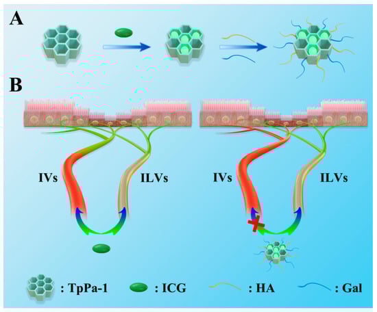 (A) Synthesis process of TpPa-1@ICG-HG. (B) Schematic of intestinal LVs targeting fluorescence imaging of TpPa-1@ICG-HG (IVs: Intestinal Vessels; I LVs: Intestinal Lymphatic Vessel).