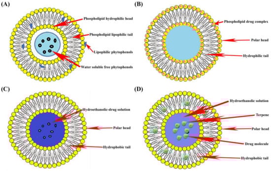 Phytosomes are phospholipid and herbal drug extract complex vesicles in which phytoconstituents are bound by a phospholipid layer (Figure 1). Phospholipids have the property of an active emulsifier because of their hydrophilic head and lipophilic tail. The emulsifier property of phytosomes improves phytopolyphenol’s bioavailability by facilitating them to pass from the aqueous to the lipophilic environment of the cell membrane [31]. Researchers have reported improved hepatoprotective and antioxidant effects of silybin phytosomes formulation in comparison to silybin alone [32]. Researchers have reported ginkgo phytosomes and their improved effect on the brain and vascular protection. Researchers have also prepared rutin phytosomes transdermal formulation and found its remarkable effect in rheumatoid arthritis [33,34].