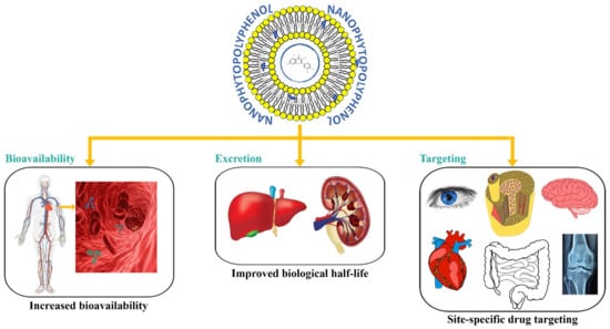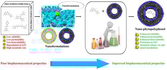 Schematic representation of biopharmaceutical improvements of dietary polyphenols for nanodeliveries.