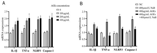 The mRNA expression of inflammatory cytokines of THP-1 cells (n = 3/group). (A): THP-1 cells were treated with three different concentrations of AGE. (B): THP-1 cell were pre-treated with 400 μmol/L of NaB for 24 h, and then treated with 400 μg/mL of AGEs to induce inflammation. NC: normal control; L-AGEs: 100 μg/mL AGEs; M-AGEs: 200 μg/mL AGEs; H-AGEs: 400 μg/mL AGEs; NaB: 400 μmol/L NaB; AGEs: 400 μg/mL AGEs; AGEs+NaB: pre-treated with 400 μmol/L of NaB for 24 h, and then treated with 400 μg/mL of AGEs. *: compared with the NC group, p < 0.05; #: compared with the AGEs group, p < 0.05.