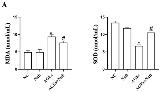 Oxidative stress plays an important role in the occurrence and development of inflammation. In this study, we determined the concentrations of ROS, MDA, and SOD in THP-1 cells. Compared with the NC group, the concentrations of ROS and MDA in the AGEs group were significantly increased, while the concentration of SOD was significantly decreased (p < 0.05) (Figure 2). Compared with the AGEs group, NaB can significantly increase the expression of SOD and decrease the expressions of ROS and MDA (p < 0.05) (Figure 2).