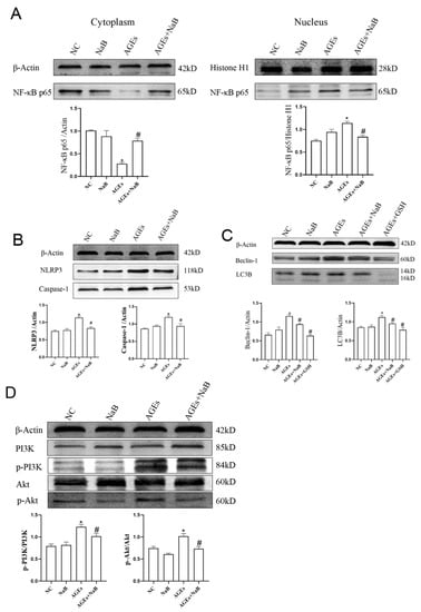 Compared with the AGEs group, after treatment with NaB, the expression of NF-κB p65 in the nucleus was significantly decreased, and the expression of NF-κB p65 in the cytoplasm was significantly increased (p < 0.05) (Figure 3A). After treatment with NaB, compared with the AGEs group, the expressions of NLRP3 and Caspase-1 were significantly decreased (p < 0.05) (Figure 3B). It is known that beclin-1 and light-chain-associated protein B (LC3B) are key proteins in autophagy, and autophagy plays an important role in regulating inflammation. Compared with the AGEs group, the expressions of Beclin-1 and LC3B in the AGEs+NaB group were significantly decreased (p < 0.05) (Figure 3C). The PI3K/Akt pathway is an upstream pathway of NLRP3 and NF-κB and is the important regulatory signal of autophagy. In this study, with the pre-treatment of NaB, the expressions of p-PI3K and p-Akt were significantly inhibited in AGEs-treated cells (p < 0.05) (Figure 3D).
