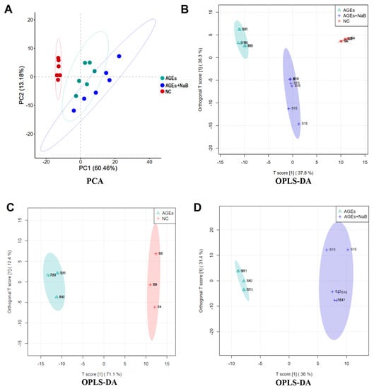 The PCA (A) and OPLS-DA (B–D) score plot. The NC group (red), the AGEs group (green) and the AGEs+NaB group (blue) (n = 6/group).