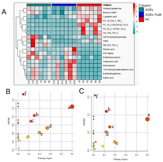 The cluster heat map and metabolic pathway analysis (n = 6/group). (A): Cluster heat map for the NC group (red), the AGEs group (green), the AGEs+NaB group (blue). (B): The metabolic pathway analysis of THP-1 cell metabolites in the NC and AGEs groups. a: D-glutamine and D-glutamate metabolism, b: biotin metabolism, c: arginine biosynthesis, d: sphingolipid metabolism, e: slanine, aspartate and glutamate metabolism, f: glutathione metabolism. (C): The metabolic pathway analysis of THP-1 cell metabolites in the AGEs and AGEs+NaB groups. a: D-glutamine and D-glutamate metabolism, b: glycerophospholipid metabolism, c: biotin metabolism, d: arginine biosynthesis metabolism, e: alanine, aspartate and glutamate metabolism, f: sphingolipid metabolism.