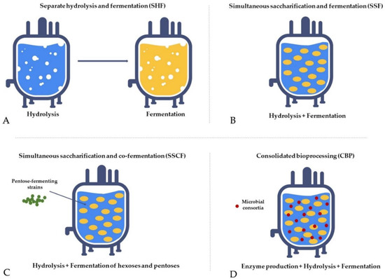 - Separate hydrolysis and fermentation (SHF)—Hydrolysis and fermentation processes are conducted independently in different units. Carbohydrates from pretreated biomass are degraded to monosugars in a hydrolysis reactor and subsequently converted to ethanol in a fermentation unit. It is a time-consuming and cost-intensive process due to the long residence time needed for complete hydrolysis, high enzyme loading, and material costs required for two separate units, and its main drawback is end-product inhibition (Figure 8A) [157,158,159,160].