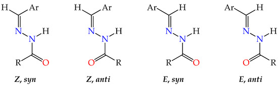 - Munir, R.; Javid, N.; Zia-ur-Rehman, M.; Zaheer, M.; Huma, R.; Roohi, A.; Athar, M.M. Synthesis of Novel N-Acylhydrazones and Their C-N/N-N Bond Conformational Characterization by NMR Spectroscopy. Molecules 2021, 26, 4908. [Google Scholar] [CrossRef] [PubMed]