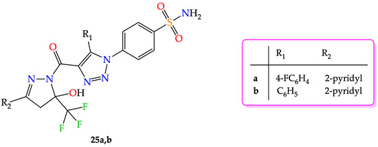 - Sharma, V.; Kumar, R.; Bua, S.; Supuran, C.T.; Sharma, P.K. Synthesis of novel benzenesulfonamide bearing 1,2,3-triazole linked hydroxy-trifluoromethylpyrazolines and hydrazones as selective carbonic anhydrase isoforms IX and XII inhibitors. Bioorganic Chem. 2019, 85, 198–208. [Google Scholar] [CrossRef]