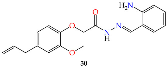 - Rohane, S.H.; Chauhan, A.J.; Fuloria, N.K.; Fuloria, S. Synthesis and in vitro antimycobacterial potential of novel hydrazones of eugenol. Arab. J. Chem. 2020, 13, 4495–4504. [Google Scholar] [CrossRef]