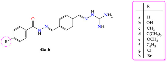 - Yao, X.; Hu, H.; Wang, S.; Zhao, W.; Song, M.; Zhou, Q. Synthesis, Antimicrobial Activity, and Molecular Docking Studies of Aminoguanidine Derivatives Containing an Acylhydrazone Moiety. Iran. J. Pharm. Res. 2021, 20, 536–545. [Google Scholar] [CrossRef]