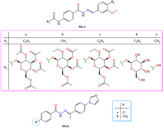 - Guilherme, F.D.; Simonetti, J.É.; Folquitto, L.R.S.; Reis, A.C.C.; Oliver, J.C.; Dias, A.L.T.; Dias, D.F.; Carvalho, D.T.; Brandão, G.C.; de Souza, T.B. Synthesis, chemical characterization and antimicrobial activity of new acylhydrazones derived from carbohydrates. J. Mol. Struct. 2019, 1184, 349–356. [Google Scholar] [CrossRef]