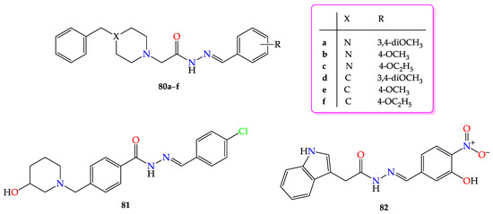 - Parlar, S.; Sayar, G.; Tarikogullari, A.H.; Karadagli, S.S.; Alptuzun, V.; Erciyas, E.; Holzgrabe, U. Synthesis, bioactivity and molecular modeling studies on potential anti-Alzheimer piperidinehydrazide-hydrazones. Bioorganic Chem. 2019, 87, 888–900. [Google Scholar] [CrossRef]