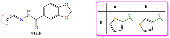 - Jacomini, A.P.; Silva, M.J.V.; Silva, R.G.M.; Gonçalves, D.S.; Volpato, H.; Basso, E.A.; Paula, F.R.; Nakamura, C.V.; Sarragiotto, M.H.; Rosa, F.A. Synthesis and evaluation against Leishmania amazonensis of novel pyrazolo[3,4-d]pyridazinone-N-acylhydrazone-(bi)thiophene hybrids. Eur. J. Med. Chem. 2016, 124, 340–349. [Google Scholar] [CrossRef]