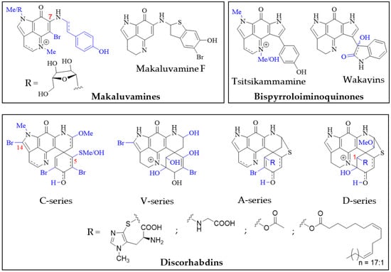 Pyrroloiminoquinone molecular structures are characterized by a condensed tricyclic pyrrolo[4,3,2-de]quinoline core that is also considered the principal pharmacophore of this compound class responsible for their antiproliferative and cytotoxic effects [7,22]. Most compounds of this class can be assigned to one of three major classes exhibiting distinct core structures, namely makaluvamines, bispyrroloiminoquinones and discorhabdins (Figure 1).