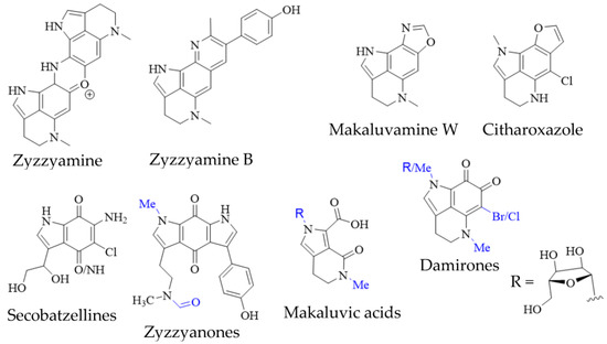 In addition to true pyrroloiminoquinones, several closely related natural products have been isolated from marine sponges, often as minor secondary metabolites alongside makaluvamines, discorhabdins and tsitsikammamines (Figure 4). They include the secobatzellines from a Caribbean Strongylodesma sp. sponge [19] (reassigned from Batzella [81]); zyzzyanones from Australian Z. fuliginosa [45,82]; makaluvic acids from Micronesian Z. fuliginosa [40] and South African Strongylodesma aliwaliensis [83]; the oxazole-containing makaluvamine W from Tongan Strongylodesma tongaensis [53]; the structurally related citharoxazole from Mediterranean Latrunculia citharistae [84] and zyzzyamines from Papua New Guinean Z. fuliginosa [85].