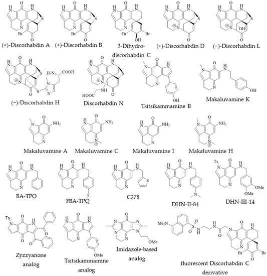 Inspired by the natural products, several types of pyrroloiminoquinone analogs have been synthesized over the years, leading to potential drug leads, some of which showed promising in vivo anticancer profiles. Synthetic protocols have been developed for many pyrroloiminoquinones and related analogs. A detailed discussion of their chemical synthesis is beyond the scope of this review and we refer the interested reader to several focused articles [35,36,37]. This review aimed to summarize the chemical diversity of pyrroloiminoquinones, and related compounds isolated to date, as well as the current state of knowledge pertaining to their biosynthetic origin and the potential these remarkable alkaloids hold as potential drug leads.