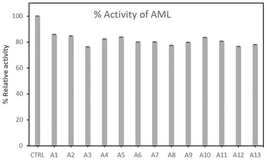 Figure 1. Relative activity of Amano lipase (AML) after immobilization on activated carbon samples from A1 to A13. Data are presented with 95% confidence intervals (error bars).