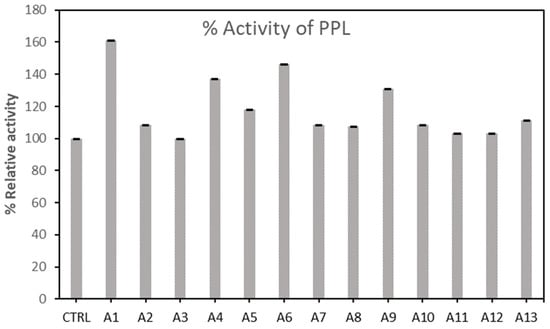 Figure 2. Relative activity of the Porcine enzyme (PPL) after the immobilization on activated carbon samples, from A1 to A13.