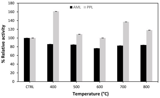The surface morphology, surface area, and pore size of AC were all affected by activation time and temperature. The relative activity of two types of lipases immobilized on activated carbon prepared at various temperatures is reported in Figure 3. The carbonization temperature for all samples of AC was in the range of 400–800 °C. The enzymatic activity without AC was taken as 100% (control samples). Subsequently, Figure 3 illustrated that AML showed no improvement in enzymatic activity when immobilized on AC, while porcine lipase PPL showed more interaction with AC. As shown in Figure 3, the carbonization temperature of AC at 400 °C resulted in the highest activity for the porcine lipase. It is also worth noting that, at 700 °C, the results improved slightly. However, from a saving energy point of view, a low temperature is recommended. Therefore, 400 °C was selected as the best carbonization temperature to prepare AC in the enzymatic reaction.