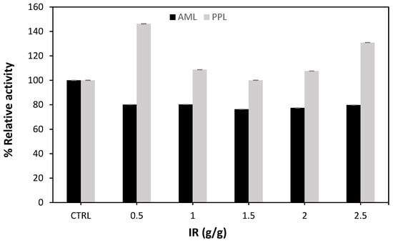 Figure 4. Effect of impregnation ratio (samples A3 and A6–A9) on relative activity for two types of immobilized lipases, Amano lipase (AML) and porcine lipase (PPL), compared to the free enzyme (CTRL).