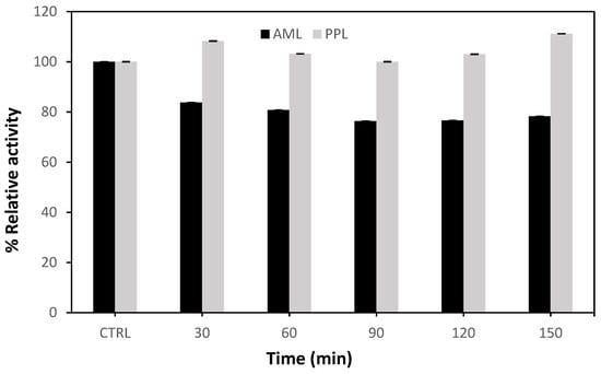 Surface morphology, surface area, and pore size are all affected by carbonization time. Figure 5 shows the impact of carbonization time of AC on the immobilized lipase’s activity. The carbonization time for all AC samples was about 30–150 min. For the enzymatic activity of lipase, at a constant activation temperature, the influence of changing the activation time was detected. Without AC, enzyme activity was 100%. Following that, Figure 5 showed that AML recorded no enhancement in the enzymatic activity (85%), while PPL interacted with AC more effectively, providing greater and more stable adsorption with AC; this is mainly due to evaporation of volatile materials from the pores and surface of AC [30]. At the same time, new pores and active sites formed on the surface of the carbon, which can contribute to lipase immobilization. The following conditions were optimal for preparing AC for PPL lipase immobilization: an impregnation ratio of 0.5 (NaOH/palm raceme, (g/g)) and activation temperature of 400 °C for 150 min.
