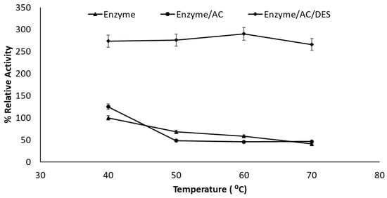 As the reaction temperature was raised, enzyme activity gradually increased until it reached a certain point (around 60 °C). However, the reaction rate slowed significantly due to protein denaturation at higher temperatures [31]. At high temperatures, the heat-induced disruption of non-covalent bonds triggered the partial unfolding of the enzyme. Further, because most known enzymes are proteins, they are protected from dehydration by water molecule layers which are bound to the surface of the protein. This hydrating layer, or at least a fraction of it, is a necessary component of the structure of the protein which is to serve as an enzyme [32]. Raising the temperature or adding organic solvents could significantly change the protein composition, leading to denaturation. As a result of many water molecules being withdrawn from the protein’s hydrating layer, exposing the enzyme to elevated temperature, the enzyme is inactivated. This is apparent because the enzyme’s relative activity hit 290.20% even at 70 °C when DES and AC were added as the necessary water layer required for the enzymatic activity, which is preserved due to the protein’s adsorption on AC and AC/DES complex. AC-DES exhibited good stability at an elevated temperature, as the DES was acting as additional coating and protecting the enzyme from denaturing. For instance, the experimental results indicated that lipase incubation in slightly hydrated alanine [5% (v/v)] led to the highest level of residual activity, implying interfacial activation [33]. Furthermore, several researchers have reported that glycerol-containing DESs promote lipase activity [34,35].