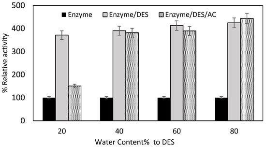 The fundamental factor which distinguishes molecular behavior in different media is the effect of water hydration between the enzyme and the bulk solvent [36]. The reaction was carried out in the DES as a medium without changing the water content of the DES in the previous section (Section 3.2). However, according to previous studies, water is needed both for the three-dimensional arrangement of enzymes and the stabilization of protein [37]. Water content in the range of 20–80% was investigated. Figure 7 shows the effect of water content on the immobilized lipase. DES improved the relative enzymatic activity up to 3–4-fold in the range of 20–80% water content. Nevertheless, introducing the DES/AC complex to the reaction media improved the relative activity up to 2–4-fold in the range of 20–40%. Overall, increasing the water content of DES slightly increased the relative activity after 40%.