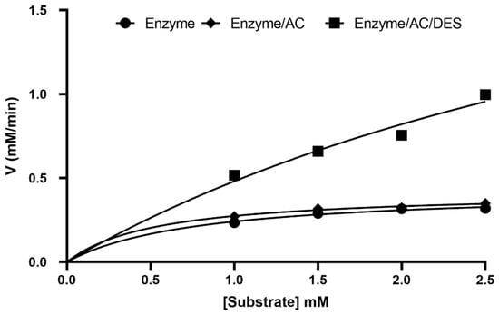Further experiments were carried out to observe how AC with DES affected the kinetic parameters as contrasted to the buffer medium (control sample). Table 2 summarizes the findings. Measurements of enzyme activity with different concentrations of the substrates were used to evaluate the KM and VMAX values of the reaction of the hydrolysis of pNPP. The non-linear Michaelis–Menten curve was used to determine the parameters with which to express the enzyme kinetics.