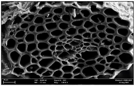 The surface morphology of activated carbon was observed under scanning electron microscopy (SEM). The morphology of the activated carbon surface 1000 magnified is shown in Figure 10.