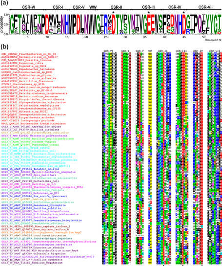 (a) Sequence logo of the newly proposed GH13 subfamily GH13_46. CSR-I, residues 10–15; CSR-II, residues 23–31; CSR-III, residues 32–39; CSR-IV, residues 40–45; CSR-V, residues 16–20; CSR-VI, residues 1–9; CSR-VII, residues 46–54; WW region, residues 21–22. The catalytic triad, i.e., the catalytic nucleophile (No. 27, aspartic acid), the proton donor (No. 36, glutamic acid), and the transition-state stabilizer (No. 45, aspartic acid) are indicated by asterisks. The logo is based on 108 sequences. (b) Conserved sequence regions for the α-amylase representatives. Twenty-four selected members (of all 108 studied in the logo) of the newly proposed GH13 subfamily represented by the cyclomaltodextrinase from Flavobacterium sp. No. 92 (red sources) and one sequence represented each GH13 subfamily (for details, please, see Table S1). Each protein is labeled by its UniProt accession number and the name of the organism. If known, the enzyme specificity is given preceded by the GH13 subfamily number. The abbreviations of the enzymes are explained in Table S1. The color code for the selected residues: W, yellow; F, Y—blue; V, L, I—green; D, E—red; R, K—cyan; H—brown; C—magenta; G, P—black. The catalytic triad is signified by asterisks below the CSRs.
