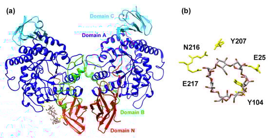 The visualization of the docking trials. (a) The dimeric structure of the cyclomaltodextrinase from Flavobacterium sp. No. 92 ([24]; PDB code: 1H3G) docked with β-cyclodextrin. (b) Detailed view of the potential binding site with a display of residues that could be involved in ligand binding. The individual domains are colored as follows: N-terminal domain—red; catalytic domain A—blue; domain B—green; domain C—cyan. For the sake of clarity, the numbering of the selected residues corresponds to the numbering of the amino acid sequence (UniProt: Q8KKG0), including the signal peptide. While the two residues, Glu25 and Tyr104, come from the N-terminal domain, the remaining three residues, Tyr207, Asn216, and Glu217, belong to the catalytic domain.
