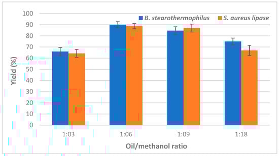 Thanks to its low-cost, methanol, the highly reactive alcohol, is commonly used for biodiesel production by transesterification reaction which requires 3 mol of alcohol per 1 mol of triacylglycerol to produce 3 mol of fatty acid methyl ester (FAME) and 1 mol of glycerol. Since it is highly recommended for base catalyst reactions to use an excess methanol: oil ratio [22], the effect of several oil/methanol molar ratios (ranging from 3:1 to 18:1) on the biodiesel yield, produced by using individual immobilized lipase, was investigated. Obtained data are illustrated in Figure 1 and clearly showed that the highest biodiesel yield values of 90 ± 2.64% and 88.66 ± 2.3% were achieved using a ratio of 6:1 by Bacillus and Staphylococcus lipases, respectively (Figure 1).