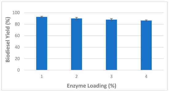 The effects of enzyme loading on biodiesel production from WCOs were also investigated and obtained data are shown in Figure 2. The amount of CaCO3-immobilized lipase ranged from 1 to 4%. B. stearothermophilus and S. aureus lipases were mixed at a 1:1 ratio, while other factors including methanol:oil ratio (6:1), total reaction time (24 h), water content (5%), stirring speed (150 rpm) and temperature (45 °C) were kept constant. After 24 h, the highest biodiesel yield (92.66 ± 1.15%) was observed at a 1% enzyme loading (Figure 2).
