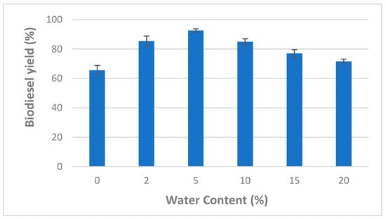 Effect of water content on mixed CaCO3-immobilized-lipase catalyzed transesterification process of waste cooking oil (WCO) for biodiesel synthesis. Experimental conditions were: methanol/oil molar ratio: 6:1, lipase loading 1%, reaction temperature: 45 °C, reaction time 24 h, agitation speed 150 rpm. Experiments were performed in triplicate and error bars indicate mean ± standard deviation.