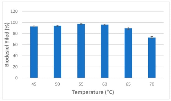 Binhayeeding et al. [16] reported that 45 °C was found to be the optimum temperature for the production of biodiesel using PHB-immobilized mixed C. rugosa and R. miehei lipases [16]. Similarly, Tran et al. [24] found that biodiesel production using C. vulgaris ESP-31 lipase decreased when temperature values increased up to 50 °C. In this study, subsequent experiments were carried out at 55 °C [24].
