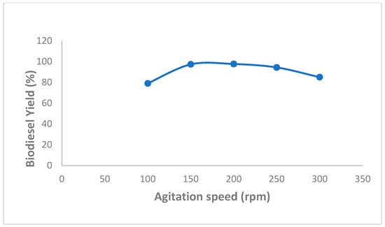 Moreover, several studies demonstrated that high biodiesel production yields might be reached by immobilized enzymes using an optimized agitation speed. In this regard, the effect of various agitation speeds, ranging from 100 to 300 rpm, on biodiesel production was also evaluated and obtained data are shown in Figure 5. As we can see, the highest percentage yield of biodiesel (97.66 ± 0.57%) was attained using an agitation speed of 200 rpm (Figure 5).