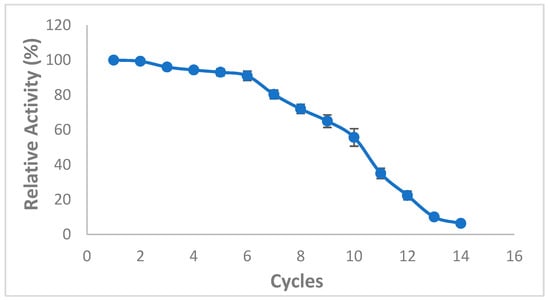The use of immobilized lipases as biocatalysts displays great potential to ameliorate the environmental sustainability and efficiency of several industrial processes, in particular biodiesel production industry. Interestingly, Zhang et al. [42] reported that CaCO3 adsorption technique exhibits exceptional reusable ability and mechanical rigidity for many cycles of the catalyzed reaction [42]. Thus, the reusability of immobilized lipase is of a particular importance to ascertain the feasibility of industrial-scale enzymatic biodiesel production [43]. The reusability of immobilized lipase mixture was therefore tested over 14 reaction cycles (Figure 7). First, 91 ± 2.64% of the original lipase activity was maintained even after 6 cycles, then approximately 55% of the initial lipase activity was recorded after 10 cycles indicating a promising potential reusability of the lipase mixture under the optimized experimental conditions, probably due to the enzyme interaction with the support enhancing its stability. However, after 12 cycles, the enzyme activity diminished remarkably likely due to methanol-induced conformational change and/or inactivation of lipase after numerous reaction cycles and the de-sorption, rupture of chemical bonds or erosion of the support material during the washing and recovery processes [44,45] (Figure 7).