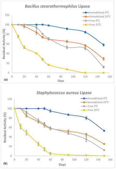 It is well documented that the long-term storage of immobilized lipase enzymes for future use is among the most important factor for their industrial applications which is considered a significant advantage of immobilized lipases over free ones [14,16,46]. In the current report, both CaCO3-immobilized B. stearothermophilus and S. aureus lipases exhibited an enhanced storage capacity compared to free enzymes. Additionally, both mixed and single immobilized lipases displayed comparable storage capacities. Both immobilized lipases were almost fully active after storage for 60 days at 4 °C and then lost up to 47% activity after 150 days of storage (Figure 8). However, free enzymes retained only ~50% of their initial activities after 90 days and almost full activity was lost after 150 days of storage. Interestingly, even stored at 25 °C, both CaCO3-immobilized enzymes were almost fully active after 20 days compared to free lipases retaining only about 50% of their respective original activities.
