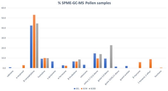 Chemical volatile percentage composition of GEL, SMC, and SCBD of C. sativa pollen samples.