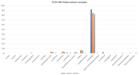 Chemical volatile percentage composition of GEL, SMC, and SCBD of C. sativa pollen extracts.