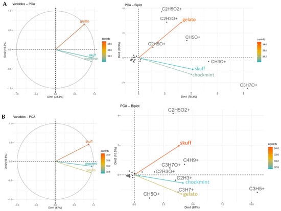 Unlike the same PTR-ToF-MS analysis applied to pollen extract samples (Figure 3B), it was found that GEL and SMC were clustered within the same quadrant, suggesting a similarity in the levels of their metabolites, while SCBD, which was the main contributor to the samples’ variability, was the most dissimilar in term of the percentage of its metabolites. PC1 explained 87.0%, and PC2 explained 10.5%. GEL and SMC were mostly characterized by C2H3+ (acetylene), C3H7+ (alkyl fragment (propene)), and C3H5+ (alkyl fragments). CH5O+ (methanol) was particularly represented in GEL. The main contributors to SCBD were C2H5O2+ (acetic acid), C4H9+ (Alkyl fragment), C2H3O+ (alkyl fragment (e.g., terpenes and other compounds)), and C3H7O+ (acetone).