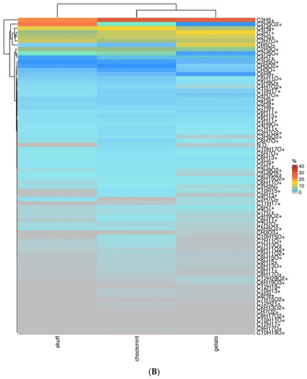 The complete list of compounds obtained by PTR-ToF-MS analysis of the pollen samples is reported in a heatmap (Figure 4A). Next to the heatmap, a hierarchical clustering (HCA) technique based on the Euclidean distance method is employed to analyze the similarities of metabolite trends in the different cultivars with a repetitive process that associates/dissociates (agglomerative/divisive methods) object by object until all are equally and completely processed [8,9]. In the first cluster, the most relevant compounds were shown to be C3H7O+ (acetone), CH3O+ (formaldehyde), and CH5O+ (methanol), identified in the three cultivars and sharing a common trend in which their levels were particularly elevated in SCBD. The second cluster defined by the dendrogram branch showed C2H3O+ (alkyl fragment (e.g., terpenes and other compounds)) and C2H5O2+ (acetic acid) as metabolites with a high level in GEL. In the third cluster, we found only the compound C2H5O+ (acetaldehyde), which showed a singular trend and was higher in GEL and SMC but lower in SCBD. C3H5O+ (alkyl fragment (e.g., hexanal/1-butanol/1-octanol)) and C3H5+ (alkyl fragments) were gathered in the fourth cluster, with an elevated percentage in SMC. Compounds under the detection threshold are represented in grey.