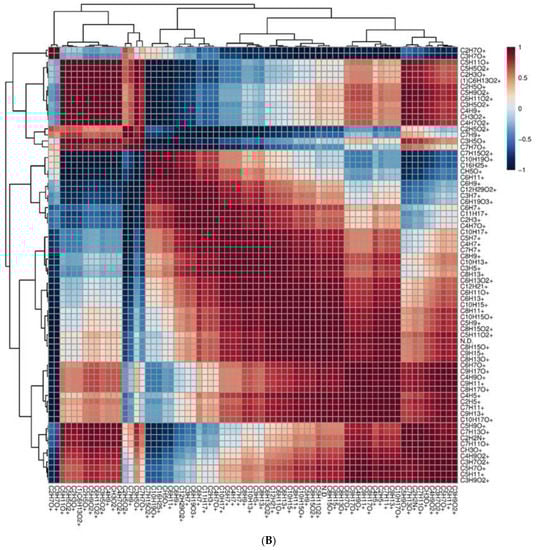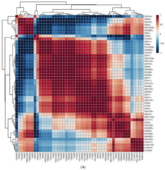 The other significant direct correlation was between 1° subgroup C8H11+ (terpenes fragments), C10H15O+ (monoterpenes oxygenate), C5H9+ (isoprene/terpenes fragments), C8H15O2+ (lactone compound), C5H11O2+ (butyl formate), C8H15O+ (1-Octen-3-one), C9H15+ (sesquiterpene fragments), and C8H13O+ ((E)-2-octenal) and 2° group C6H7O+ (phenol), C4H9O+ (2-butanone/isobutyraldehyde), C9H11+ (terpenes fragments), C8H17O+ (methyl hexyl ketone), C4H5+ (C4 fragments), C2H5+ (fragments), C7H11+ (terpenes fragments), C9H13+ (sesquiterpene fragments), and C10H17O+ (terpenoids).