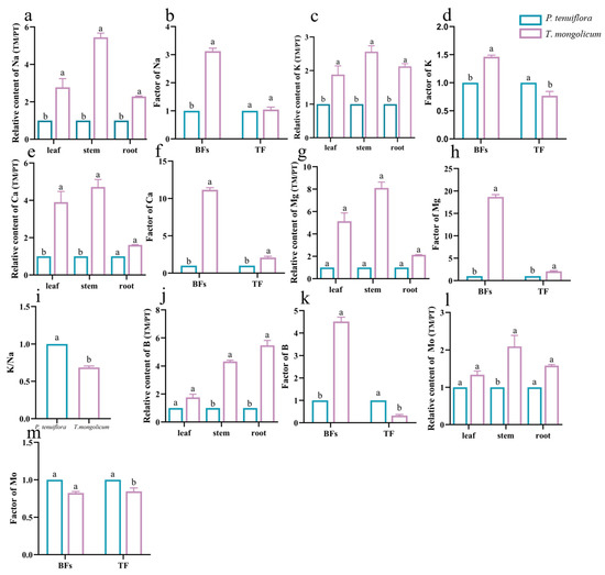 Relative abundances of significantly different elements in T. mongolicum. (a,c,e,g,j,l) Relative contents of (a) Na; (c) K; (e) Ca; (g) Mg; (j) B; and (l) Mo in T. mongolicum compared to their contents in P. tenuiflora. The contents of elements in P. tenuiflora are normalized to 1. (b,d,f,h,k,m) Factors of (b) Na; (d) K; (f) Ca; (h) Mg; (k) B; and (m) Mo in T. mongolicum compared to factors in P. tenuiflora. The factors of elements in P. tenuiflora are normalized to 1. (i) The ratio of Na and K. Element contents and factors are summarized from 3 biological replicates and presented as mean ± SEM. Different letters indicate significant differences between groups (p-value < 0.05).