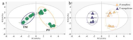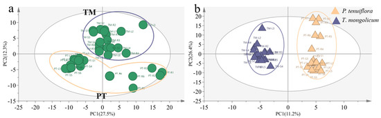 Comparison of primary metabolites between T. mongolicum and P. tenuiflora. (a) PCA score plot. Purple circle: T. mongolicum, orange circle: P. tenuiflora. TM: T. mongolicum group, PT: P. tenuiflora group. (b) OPLS−DA score plot. Purple triangle: P. tenuiflora, orange triangle: T. mongolicum.