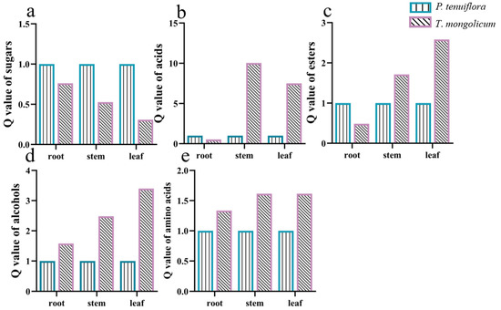 Q-values of significantly different metabolites in T. mongolicum. Relative Q-values of (a) sugars; (b) acids; (c) esters; (d) alcohols; and (e) amino acids in T. mongolicum compared to Q-values in P. tenuiflora. Q-values of metabolites in P. tenuiflora are normalised to 1.