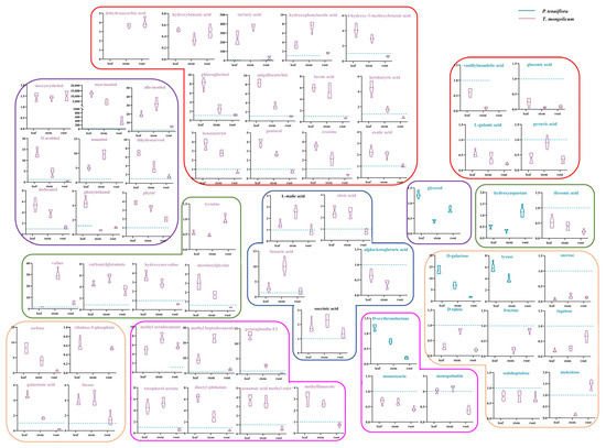 Acids involved in sugar–TCA–amino acid metabolism were also massively accumulated in the aboveground parts of T. mongolicum, increasing 243.6-fold (leaf), 367.5-fold (stem), and 30.4-fold (root) for tartaric acid; 3.4-fold (leaf) and 7.5-fold (stem) for hydroxyphenylacetic acid; 4.1-fold (leaf) and 3.0-fold (stem) for 4-hydroxy-3-methoxybenzoic acid; 8.1-fold (leaf) and 2.6-fold (stem) for phloroglucinol; 8.4-fold (leaf) and 3.3-fold (stem) for epigallocatechin; 6.0-fold (leaf) and 5.3-fold (stem) for furoic acid; 4.5-fold (leaf) and 1.6-fold (stem) for ketobutyric acid; 3.7-fold (leaf) and 2.8-fold (stem) for benzenetriol; 3.9-fold (leaf) and 2.6-fold (stem) for guaiacol; 3.5-fold (leaf) and 2.1-fold (stem) for creatine; and 2.3-fold (leaf) and 2.0-fold (stem) for oxalic acid, compared with those in P. tenuiflora. Hydroxybenzoic acid and dehydroascorbic acid were only accumulated in T. mongolicum.