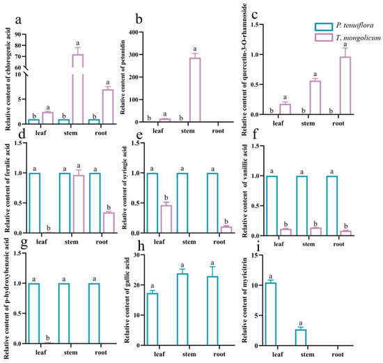 Relative contents of significantly different phenolic metabolites in T. mongolicum. Relative contents of (a) chlorogenic acid; (b) petunidin; (c) quercetin-3-O-rhamnoside; (d) ferulic acid; (e) syringic acid; (f) vanillic acid; (g) p-hydroxybenzoic acid; (h) gallic acid; and (i) myricitrin in T. mongolicum compared to their contents in P. tenuiflora. The contents of phenolic metabolites in P. tenuiflora are normalised to 1. Phenolic metabolite contents are summarised from 3 biological replicates and presented as mean ± SEM. Different letters indicate significant differences between groups (p-value < 0.05).