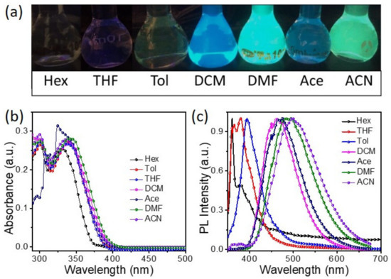 (a) Fluorescence images and (b) absorption and (c) PL spectra of BP-3-Cz in solutions with different polarities.